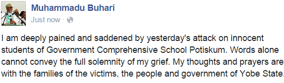 The former military Head of State took to Facebook to react to yesterday's bombing in a secondary school in Yobe that left over 47 young people dead. See more of what he wrote after the cut...