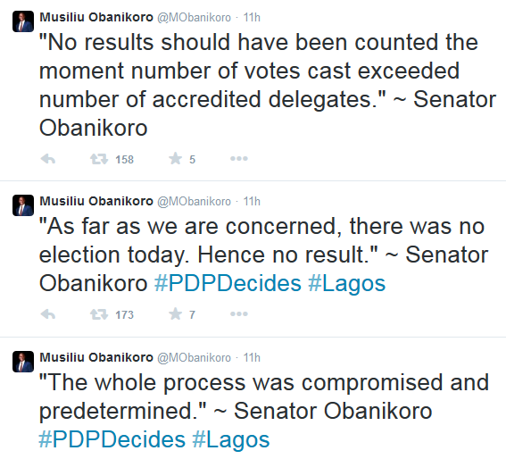 Former Minister of State for Defence, Sen. Obanikoro has condemned the PDP Primaries which held yesterday where be was defeated by pharmacist and entrepreneur, Jimi Agbaje. Agbaje scored 432 votes as against the 346 by Obanikoro. Obanikoro says the primaries was a scam. See more tweets after the cut...