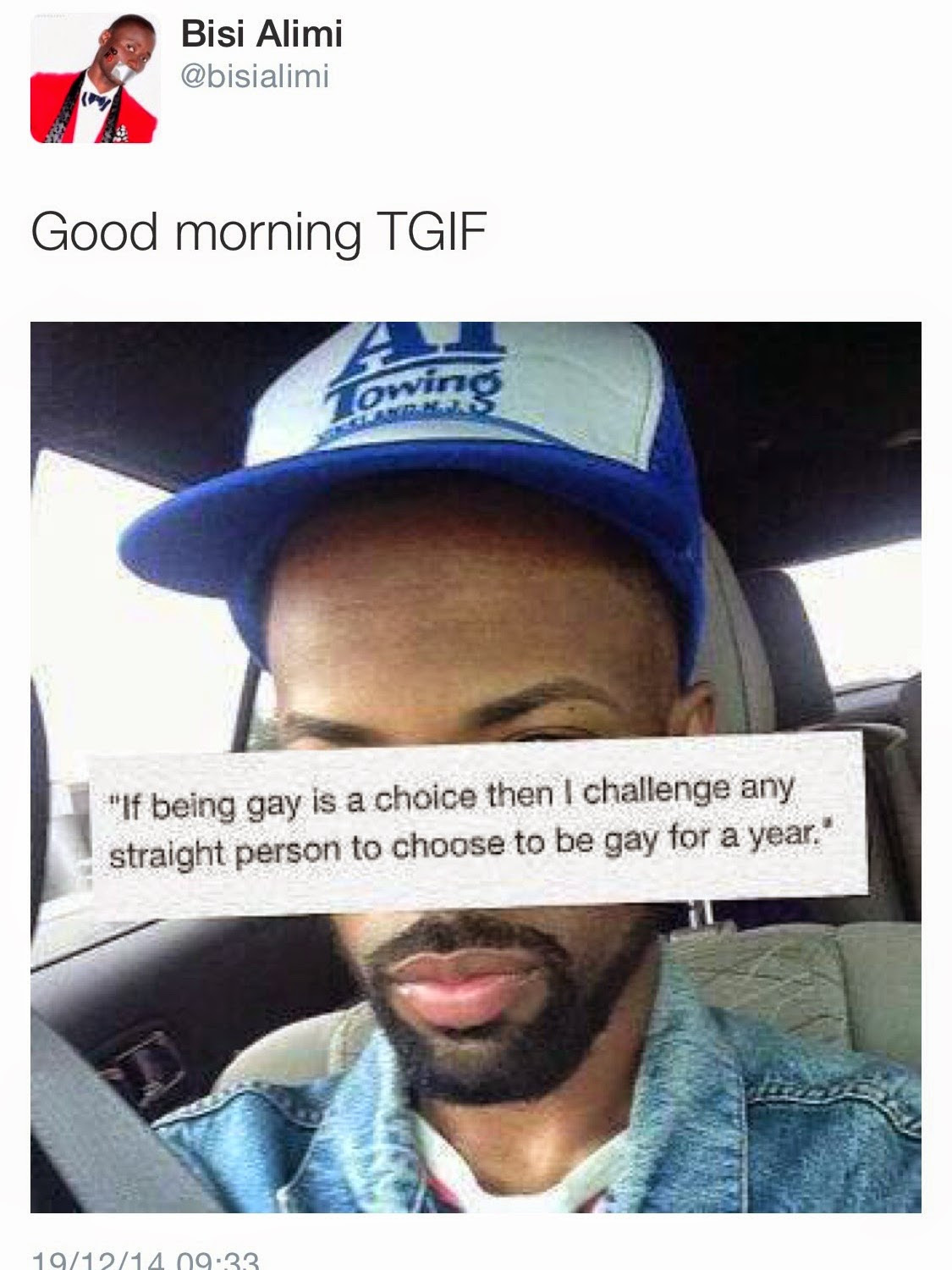 Gay Nigerian activist Bisi Alisi wrote this morning "If being gay is a choice, then I challenge any straight person to chose to be gay for a year". Thoughts?