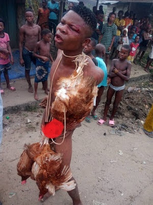 A teenage boy was supposedly caught stealing chickens onChristmas day in Ikorudo lago. The teenager was then seriously beaten  up, stripped naked, paraded round the streets and had the chickens hung round his neck. But why? More photos..