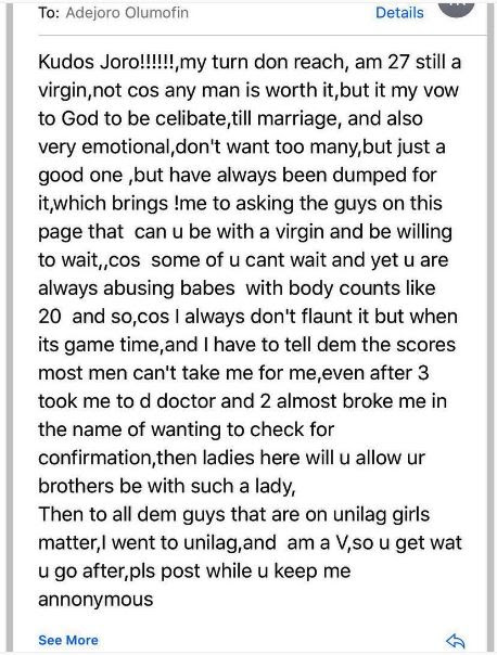 The issue of virginity is already losing its value in Nigeria as most suitors fail the challenge of being celibate during courtship as envisaged by a 27-year old University student who wrote to a relationship adviser, Joro Olumofin about her sorry plight as a virgin.